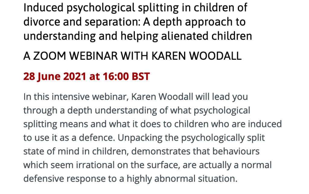 Induced psychological splitting in children of divorce and separation is a serious child protection issue. It involves working with psychologically unwell people who harm their children. It is not a matter of believing everyone who claims they are alienated just because they say they are, it is about careful differentiation and most of all about detailed and nuanced assessment and intervention. Take care out there. Most of all be careful about how your children see you, expecially if you are visible online. Telling a child they are alienated will never resolve the problem. A defence is there for a purpose, spend your time more wisely by analysising how the defence in the child arose in the first place and then seek the routes which give you the most information about how to help to heal that.