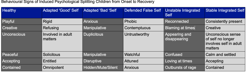Children suffering from induced psychological splitting display maladaptive behaviours over time and will, in treatment, shift those behaviours along a continuum. Working with the co-therapy model which is used at the Family Separation Clinic, a rejected parent who has been evaluated for good enough parent, in the absence of findings that this parent has contributed to rejection, is taught the skills of therapeutic parenting to assist the child in recovery. In this respect, helping the parent to understand the parts of self which are most commonly seen in alienated children, is useful as a way of a) decreasing anxiety in that parent (if the child’s behaviours are understood in context, there is less likelihood of reactive splitting) and b) empowering the parent to respond to the child’s changing behaviours in ways which are congruent to the recovery journey. The table below gives examples of how a child moves along the continuum of behaviours into the onset of splitting and how they behave in recovery (when the defence is no longer present or necessary.