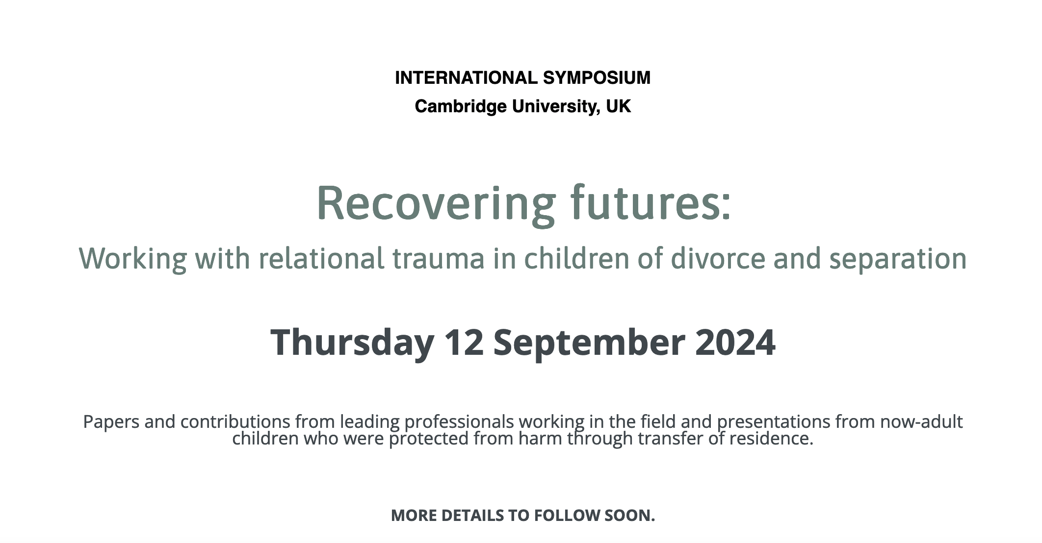The Family Separation Clinic has worked with many psychologically and emotionally abused children over the past fifteen years, some of whom have been removed from the care of an abusive parent and transferred to the care of a healthy parent. Now, some of those now adult children who were removed in residence transfer, are ready to give testimony to the harm that they suffered and their journey back to integrated psychological and emotional health. Giving evidence of the way in which their lives were shaped by abusive parents who prevented them from having relationships with their other parent and wider family members, these young people articulate the lived experience of becoming alienated from their own authentic sense of self and from the healthy parent who could protect them. Centering these voices at our International Symposium in September 2024, we will offer a child focused view of what is happening in the Family Courts in England and Wales and around the world and the importance of a child protection approach in cases where children align with a parent and reject the other after divorce and separation.