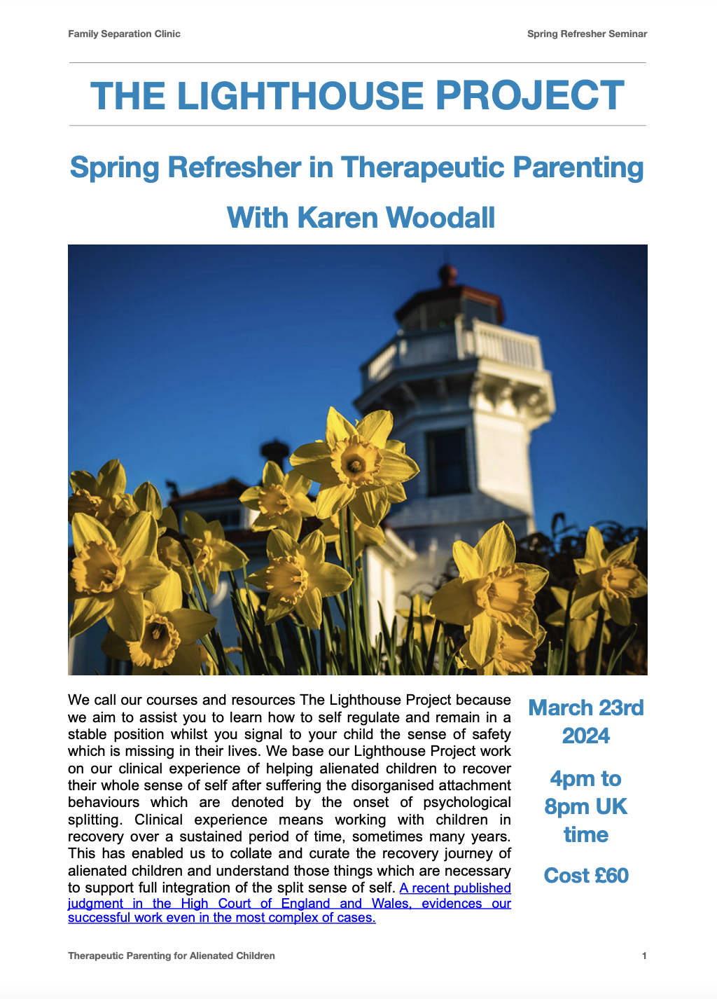 Therapeutic parenting works with alienated children because it responds to the internalised problem in the child and the manner in which this is expressed in the family system. The problem that we have had with alienated children however, is that there is often a need for a structural shift in the family system before therapeutic parenting can be effective, which means that the power that the overwhelming parent has over the child must be ameliorated somehow. This is why going to court for younger children has always been necessary, unless the court can ameliorate the power over the child, therapeutic work is considered to be ineffective.