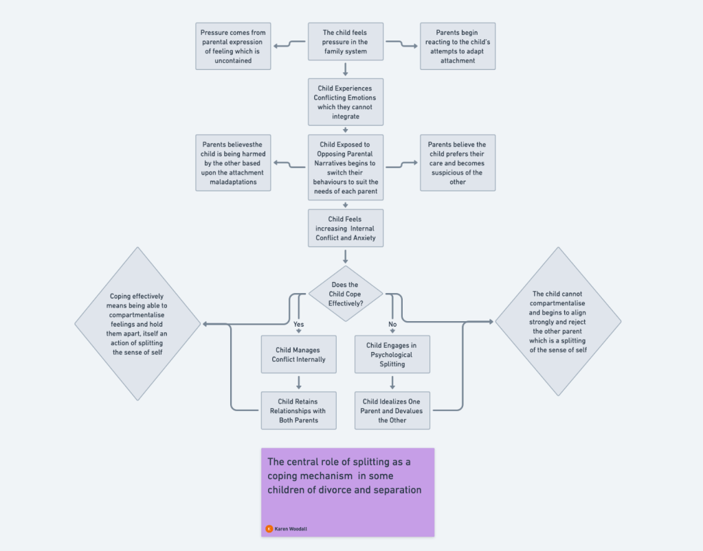 Splitting in children who align strongly with a parent and reject the other after divorce and separation is, in my view, a harm which hidden at home and normalised by the parent to whom the child is aligned. It is also normalised by campaigners who say that the child’s rejection of a parent is always because of something a parent has done and by academics who seek to convince others that their research, which is based upon self reports of parents, is evidence that splitting behaviours in children are realistic reactions to childhood abuse. I would argue that the splitting behaviours we see are in fact realistic and normal reactions to what is a very abnormal situation but they are not realistic and normal in terms of the rejection of a parent, they are realistic and normal in terms of the way that the child, through that rejection, is seeking to placate and regulate a parent who feels frighteningly out of control in a world where the child will do anything to stabilise that parent in order to feel safe.