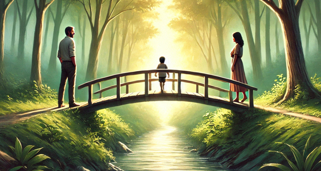 In the image above, the child is depicted in the middle of two parents, one on either side of what we call the Transition Bridge. This is a metaphor for the journey of attachment adaptation the child must make as they move between separated parents. If the bridge is not built between parents and kept safe by them, the child will, at some point in the transition between the two, find themselves completely alone in attachment terms. In such situations the bridge is a terrifying place for children with the river running beneath being full of emotional and psychological content that they cannot process because they do not possess the brain capacity or ego strength to make sense of this space around them. In addition, if, as they cross the bridge, they carry unresolved issues from the parent they have just left behind, an argument perhaps, a cross word or disapproval, or if they arrive to a parent who is angry, anxious or otherwise difficult to make sense of, the child has nothing other than their own internal efforts to adapt their attachments to find safety as quickly as they possibly can. Whilst some say that shared parenting makes things automatically easier for children, I would say that shared parenting in circumstances where there is tension, anxiety and an absence of parental collaboration around the child’s needs, is a classic situation where a child will find it difficult to adapt their attachment behaviours, leading them swiftly into the maladaptations seen in when children enter into infantile splitting as a defensive structure against impossible dynamics.