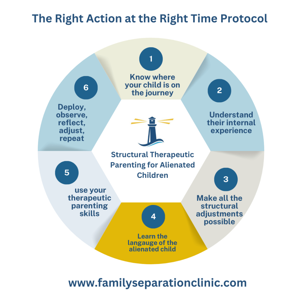 The ‘right action at the right time protocol’, is what I have called the approach we use in structural therapeutic parenting, which I have adapted to be used by parents in the rejected position for alienated children. Based upon my work with over a hundred severely alienated children, this approach has been tested outside of the Court system since 2020 and has shown repeatedly to have a beneficial impact in terms of bringing children back into proximity with the parent they have rejected and empowering the parent to know what to do as the child emerges from this attachment trauma.