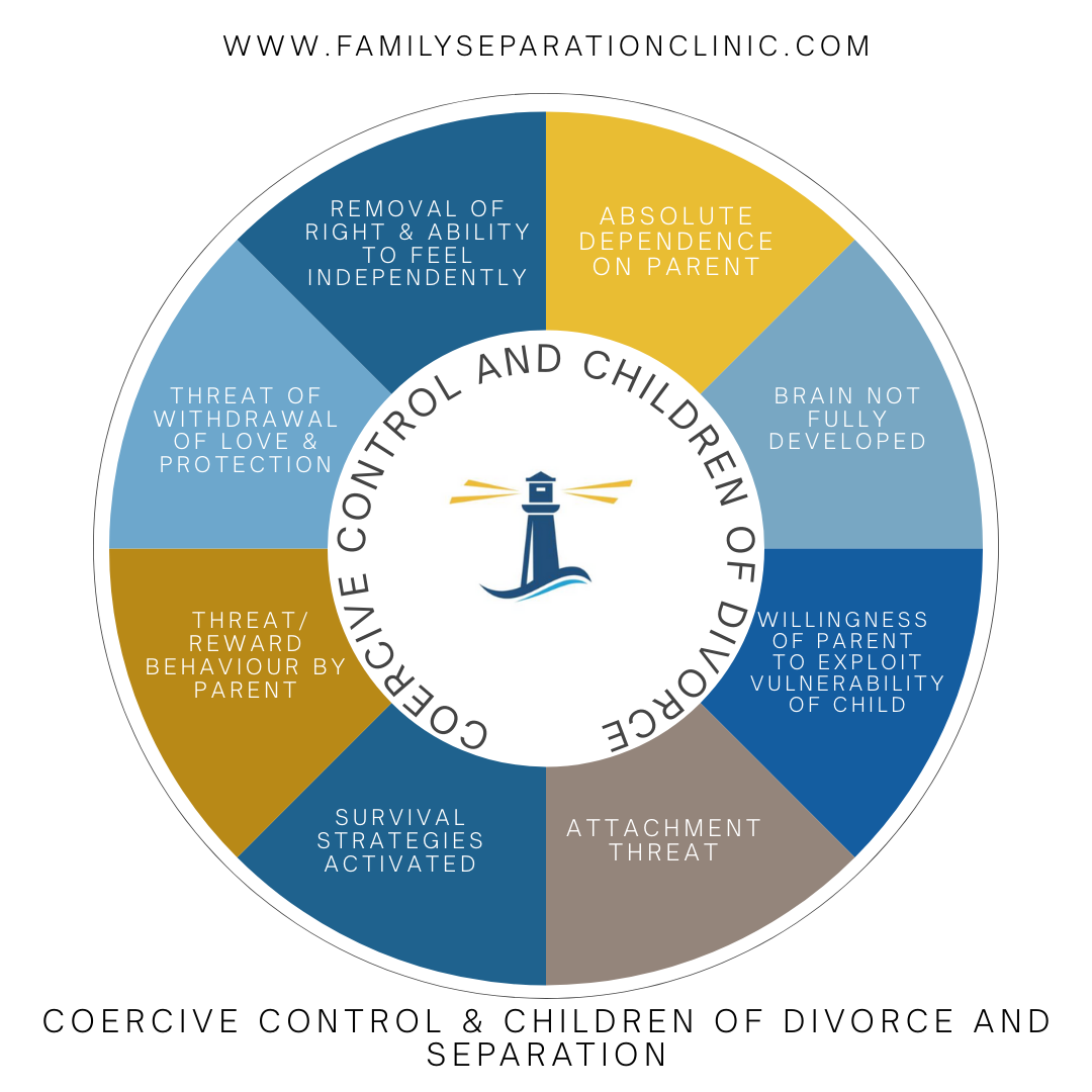Coercive control in post separation family life is centred on children because they are the most vulnerable people within the family system. When the family separates, the only people who have to find a way to relate to all adults in the system, are the children. Mothers and fathers who separate only have to focus on their own new life journey and how the child fits into that, the child has to fit into two new adult lives and make sense of their own life within that requirement.