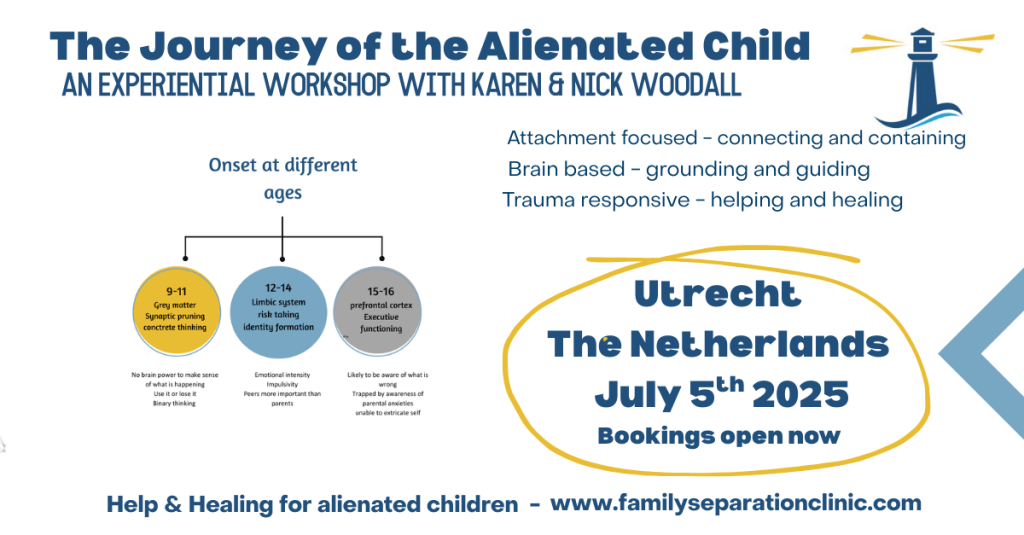 Our first face to face workshop since the Pandemic will be held in central Utrecht on 5th July 2025. Focused on the Journey of the Alienated Child, this is an experiential workshop which will help you to focus in on your child’s experience and needs at each stage in the journey from onset to recovery. Focused entirely on the psychological understanding of alienation as an attachment maladaptation within the child’s relational world, this workshop is about empowering you to become the best therapist your child could ever have.