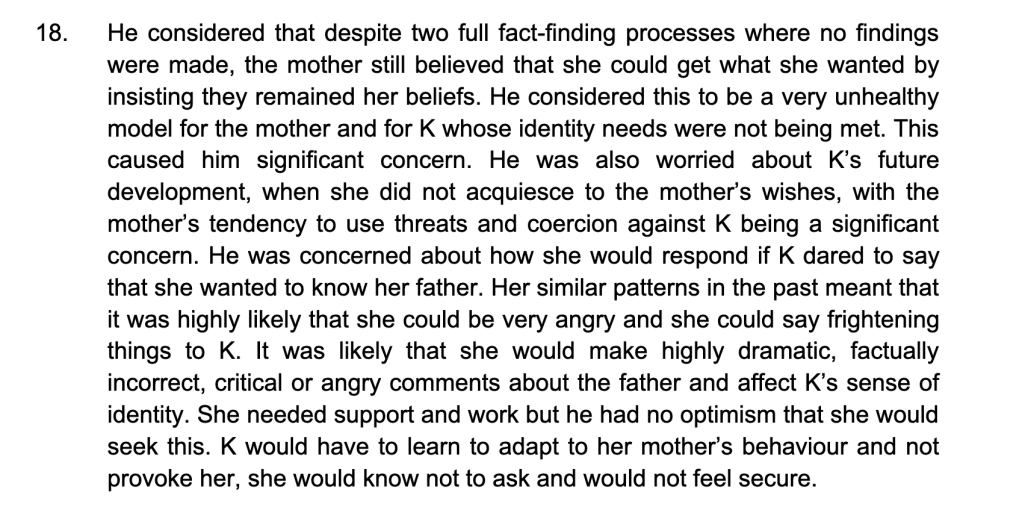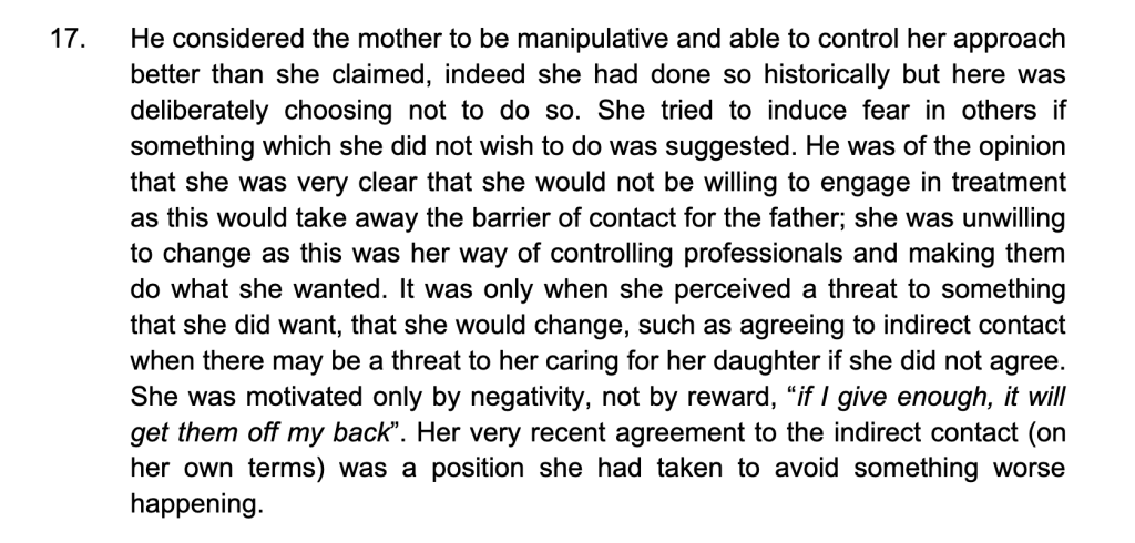 Dr Craig’s opinion in this case, is exactly what I would hope to see in a report about a mother who is unable to support the relationship between her child and father. Whilst he may not refer to alienating behaviours, his words are more or less the same as those which all Clinical Psychologists I have worked with, would use to describe implacable hostility. He goes on to accept that whilst he has no concerns about her parenting, he has concerns about her control over her child and how that control will impact upon the child as she grows older, conclusions which are identical to all those professionals I have worked with over the years who have raised the alarm about the harm that mothers cause to children in divorce and separation.