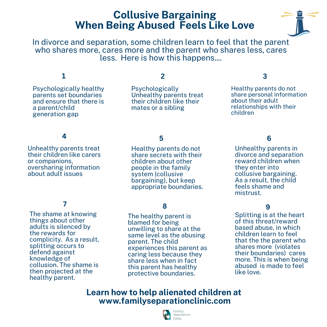 Splitting is a deeply harmful consequence of hidden harm at home which often looks nothing like what we are led to believe alienating behaviours look like. Splitting is a consequence of boundary violations which are silent and seductive, these are collusive bargains which lie, like a shameful secret within the child’s mind. As therapists and those concerned with helping alienated children we must understand what we are working with and know how to heal the underlying harms.