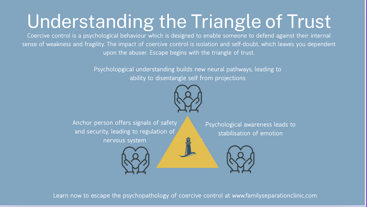 The alienated mothers group runs weekly for ten weeks from 26th January – 5-7pm (GMT), this is a small, closed group with places limited to 15. Based upon the psychological principle of the triangle of trust, which we use to rebuild a strong and stable sense of self, this group is for mothers who have experienced coercive control and who would like regular anchored support to develop psychological understanding to enable confidence in developing therapeutic parenting skills to help their children to deal with the impact of post separation abuse.